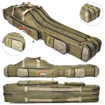 Sztywny pokrowiec trzykomorowy z twardymi ściankami dający wędkom 100% ochrony. Bardzo wysoka jakość wykonania. Materiał w 100% chroniący przed wodą. Dwie kieszenie boczne na akcesoria. Torba posiada szelkę do noszenia wędek na plecach oraz normalne, typowe uszy.
