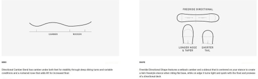 спрямований розвал - розвал під обома ногами для стабільності в глибоких поворотах і мінливих умовах і рокерний нос, який додає плавучість для кращих характеристик