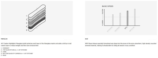 скловолокно: 45° - конструкція зі скловолокна оптимізує кожен шар скловолоконної матриці та додає повний шар карбону від пальців до п’яти, щоб зменшити вагу та точно налаштувати кручення