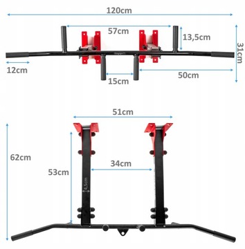- Dzięki zastosowaniu wysokogatunkowej stali drążek posiada udźwig do 150 kg. Elementy drążka połączone są ze sobą za pomocą wytrzymałych śrub zapewniających stabilność całej konstrukcji. Szerokość głównego profilu to aż 4,5cm