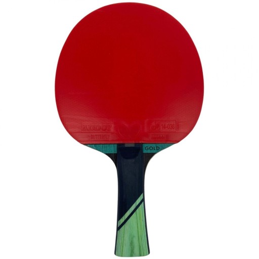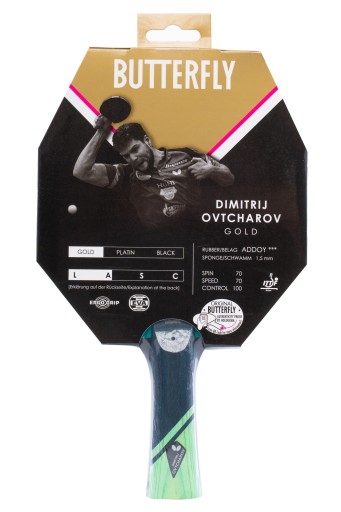 Butterfly DIMITRIJ OVTCHAROV GOLD – тренувальна ракетка, призначена для досвідчених гравців. Схвалена ITTF гума Addoy з губкою товщиною 1,5 мм, технологія Ergo Grip та інноваційний шар EVA забезпечують різноманітну гру в нападі та захисті.