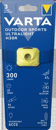 Налобний ліхтар VARTA Outdoor Sports Ultralight H30R, кліпса, кабель USB-A/microUSB 1 м, документація.