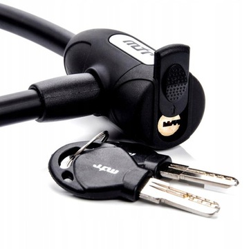 Wytrzymałe zapięcie rowerowe w postaci linki stalowej o średnicy 4,5 mm, pokrytej tworzywem sztucznym.