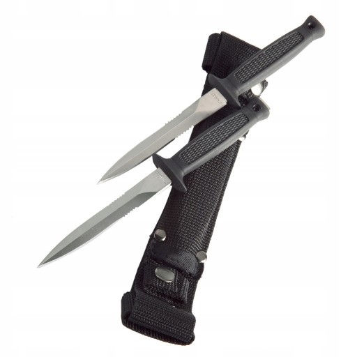 Двосторонні напівхвилясті леза кинджалів довжиною 10 см, які можна безпечно помістити в нейлонові піхви, що входять у комплект, а також розмістити на поясі.