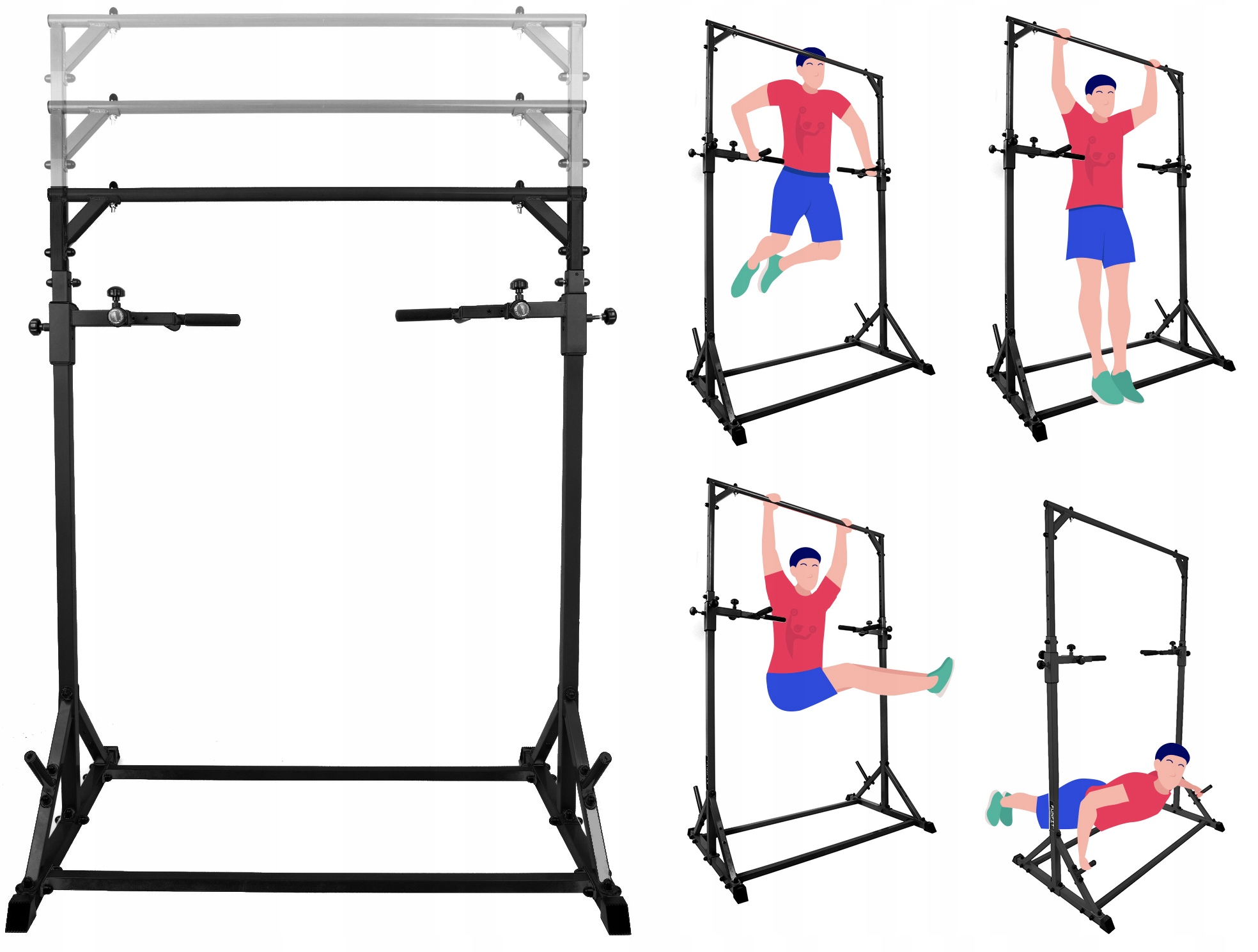 Dodatkowe, regulowane uchwyty pozwalają na wykonywanie wielu nowych ćwiczeń, np. dipów czy pompek szwedzkich - pozwala na dopasowanie rozstawu do swoich potrzeb, dzięki czemu można uzyskać chwyt o wąskim lub szerokim rozstawie.