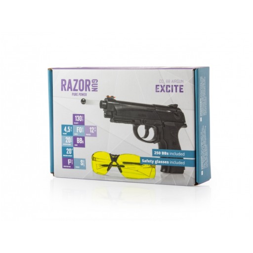 RazorGun Excite — це пневматична зброя CO2, створена за зразком італійського пістолета Beretta 90 TWO калібру 9 мм. Однак, на відміну від бойової версії, рама і замок пневматичної зброї виготовлені з легкого полімеру, стійкого до механічних пошкоджень і погодних умов.