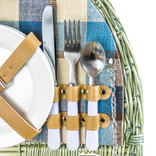 Кошик оснащений пряжкою із застібкою та шкіряною (екошкіра) ручкою для зручності транспортування. Всередині кошик обшитий красивим матеріалом, який забезпечує герметичність і покращує естетичність. Крім того, всередині кошика є кріплення для захисту посуду під час транспортування.