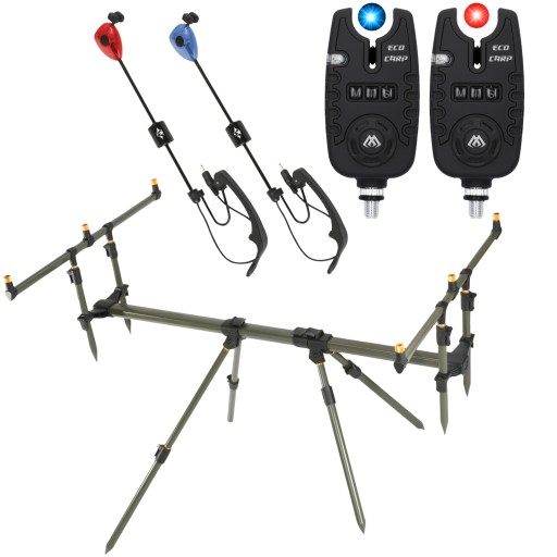 У набір входить міцна фірмова подвудка на три вудилища, два електронних індикатора клювання і два світлодіодних гойдалки з регульованим вантажем.
