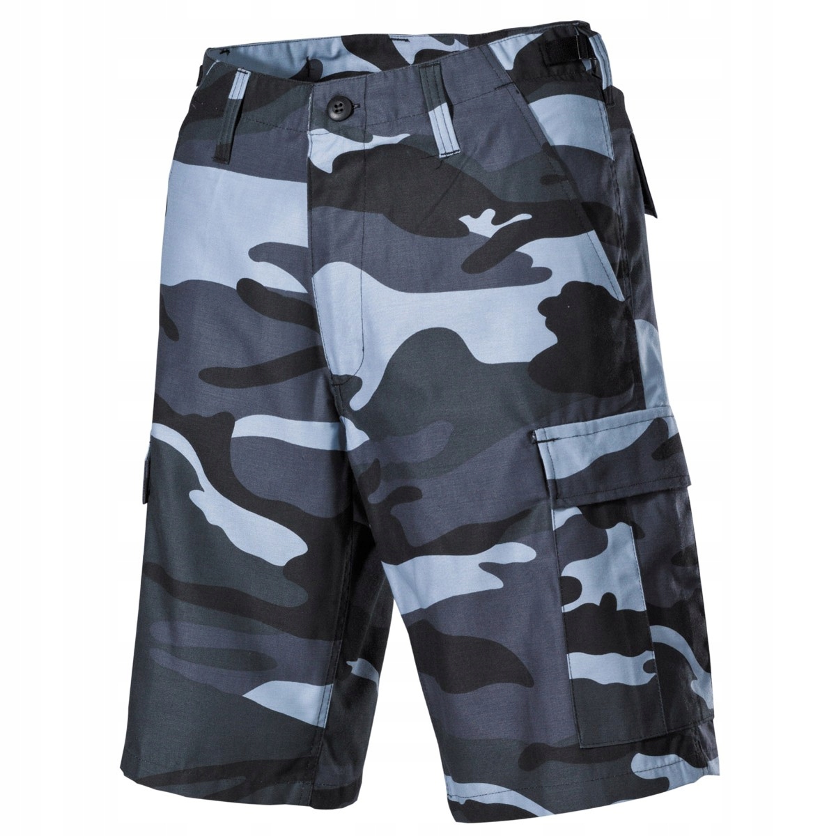 - Spodenki, niemieckiej firmy MFH, skyblue, posiadają zamek błyskawiczny, dwie boczne kieszenie, dwie kieszenie tylne z patką i guzikami, dwie kieszenie boczne na nogawkach z patką i guzikami.