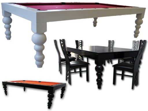 Ця модель створена так, щоб накритий стільницею виглядати як обідній стіл, сіток і кошиків не видно. Вони монтуються в ніжці, тому візуально не нагадують більярдний стіл. Його охоче купують для віталень, а в поєднанні з насиченими кольорами це також дуже престижна модель.Дизайн ретельно продуманий, щоб покупець жодним чином не торкався конструкції столу і зручно сидів за ним.