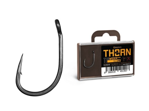 Delphin THORN - це першокласна лінійка високоякісних коропових гачків. Завдяки сучасним технологіям, які були використані у виробництві гачків, вони є синонімом безкомпромісної міцності та максимальної гостроти. Гачки серії THORN мають титанову поверхню, яка надає їм матово-сіру поверхню, яка також ідеально гладка для легкого лову коропа. TitanX також піклується про посилення та довговічність усього гачка.