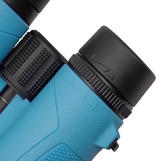 Блакитний бінокль – це міцно виготовлений оптичний інструмент з алюмінієвою рамою, покритою гумовим захисним шаром.