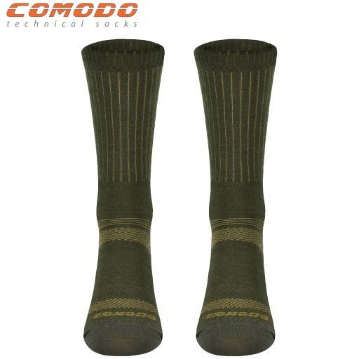 Довгі мисливські шкарпетки польської компанії COMODO ідеально підходять для будь-яких видів діяльності: спорту, туризму, виживання, військових дій, а також для повсякденного носіння. Такий фасон забезпечує відмінну терморегуляцію і можливість носити шкарпетки під високі черевики, черевики або ботфорти.