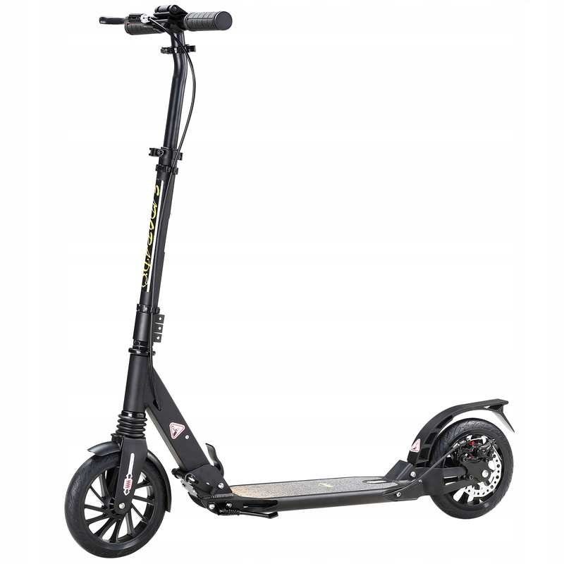 Duże koła z PU o średnicy 200 mm i wysokiej jakości łożyska kulkowe ABEC 9, idealnie do szybkiej jazdy. Mocna przyczepność rolek z pełnej gumy i tylny hamulec tarczowy zapewniają wysoki efekt hamowania i bezpieczne zatrzymanie. Oprócz hamulca tarczowego na tylnym kole hulajnoga posiada dodatkowy hamulec cierny tylnego koła (hamulec nożny). Antypoślizgowa powierzchnia stopnia zapewnia dobrą pozycję na hulajnodze. Dzięki podwójnemu zawieszeniu nierówności są amortyzowane nawet na wyboistych drogach. Zainstalowano podnóżek ułatwiający parkowanie. Bardzo duży odblask na tylnym chlapaczu zwiększa bezpieczeństwo w ciemne dni. Aluminiowa kierownica z szybkozłączką jest składana, a kierownica ma regulowaną wysokość w 4 pozycjach. Oznacza to, że hulajnoga rośnie razem z dzieckiem i może być używana również przez osoby dorosłe o wzroście do 190 cm. Potrójnie przykręcany uchwyt na kierownicy zwiększa kontrolę nad jazdą, a tym samym zapewnia lepsze wyczucie podczas jazdy. Szybko rozkładana hulajnoga jest idealnym towarzyszem na wszystkie trasy. Dzięki niewielkiej wadze jest bardzo łatwa w transporcie.