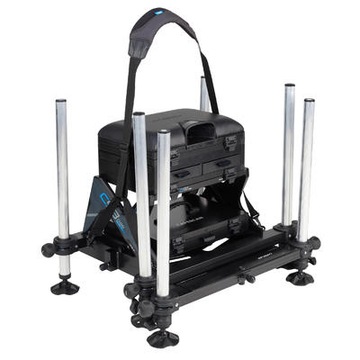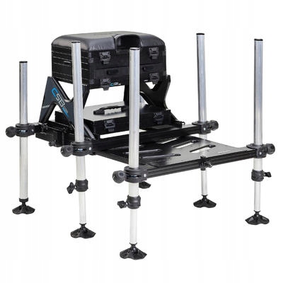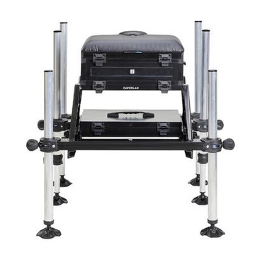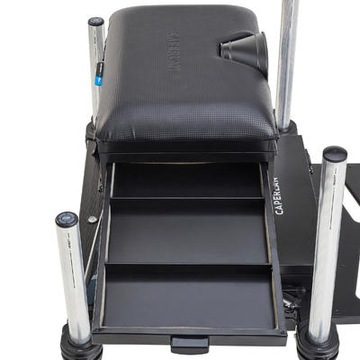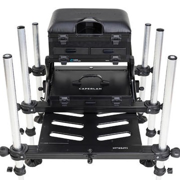 - 1 podest z łącznikiem do wózka - w dolnej części 1 kaseta + pokrywka - w górnej części 1 kaseta i 3 szuflady z separatorem (1 z boku i 2 z przodu) - 1 podpórka wędki na siedzisku - 1 siedzisko z pianki - 4 regulowane nóżki przednie (65/110cm), 2 stałe 65 cm tylne - nóżki o średnicy 36 mm (2 z 1 poziomicą i 2 z wbudowaną śrubą) - 2 łączniki podpórek kół po bokach podestu - 1 uchwyt do siatki