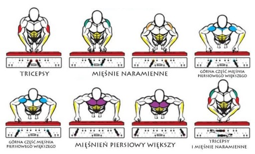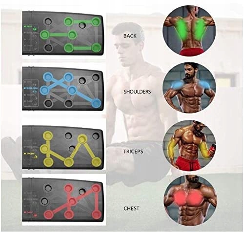 Чудовий багатофункціональний набір 16 в 1, який дозволяє встановити ручки для віджимань до 16 положень, дозволяючи опрацьовувати багато груп м'язів під час вправ. Дошка для віджимань з ручками має кольорові поділки, які вказують, яку групу м’язів ми найбільше задіюємо під час виконання вправ.