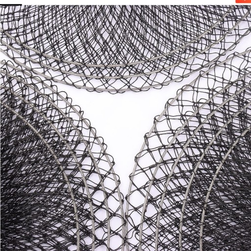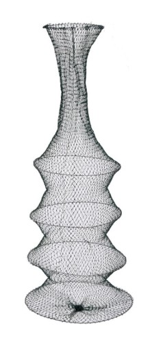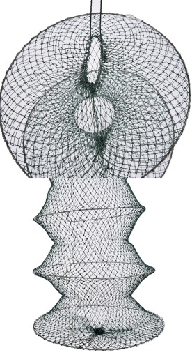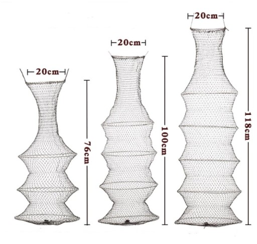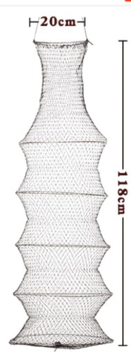 Рибальська сітка довжиною 76 см складається з 4 обручів, один вужчий вгорі приблизно 22 см і три ширші внизу приблизно 35 см.