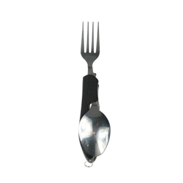 This handy pocket knife includes a set of cutlery - a spoon, fork and knife along with a bottle and can opener . It consists of two parts joined together by a hook (mandrel for the eccentric): I - fork, II - spoon and knife with an opener.