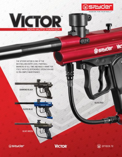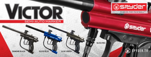 Spyder Victor - один з найдешевших напівавтоматичних маркерів, призначених для початківців. Він однозначно виділяється серед моделей інших брендів компактним дизайном і довшим, ніж у інших моделей, 10-дюймовим прикладом стовбура з різьбою Spyder. Це дуже схоже на маркери спідболу. У поточному виданні вага маркера зменшена приблизно до 900 г. Має центральну вертикальну подачу, подвійний курок (зручність стрільби), ергономічну рукоятку з нековзкими гумовими накладками. Витягнутий вгору гвинт делерину дозволяє відразу зняти затвор, вийняти розрізану кулю і прочистити весь ствол шомполом, не відкручуючи його. Дуже швидка і корисна річ