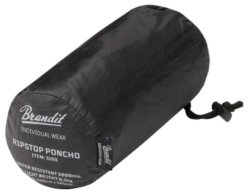 Poncho Brandit Ripstop Black (3169.2.OS) – дощозахисна накидка з дуже легкого матеріалу. Він виготовлений з матеріалу ripstop, що підвищує його міцність. Має проклеєні шви, а завдяки прикріпленій сумці розміром 14x22 см, в яку його можна упакувати, це пончо надзвичайно практичне. Пончо Brandit обладнано металевими вушками для врізання шпильок або створення даху. Капюшон має шнурок.