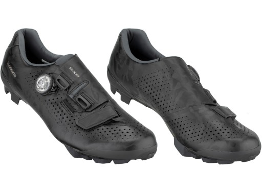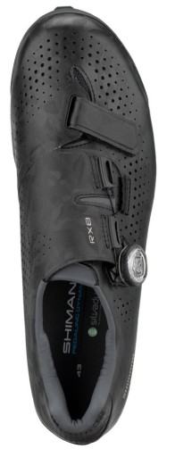 Передачу потужності забезпечує надлегка і дуже жорстка карбонова підошва з індексом 10. Відповідну стійкість стопи забезпечують спеціальні ребра жорсткості та підсилення в області п'яти. Взуття SH-RX800 розроблено для забезпечення максимальної ефективності педалювання. Хорошу посадку забезпечують липучки та вдосконалений циферблат Boa IP1 з функцією мікрорегулювання. Гумові елементи підошви виготовлені з міцної гуми, що гарантує, що якщо ми змушені зійти з велосипеда, ми зможемо це зробити з упевненістю. Напевно, райдерів порадує той факт, що одне взуття RX8 приблизно на 60 грамів легше, ніж топове взуття MTB - XC9. Вони бувають чорного та сірого кольорів.