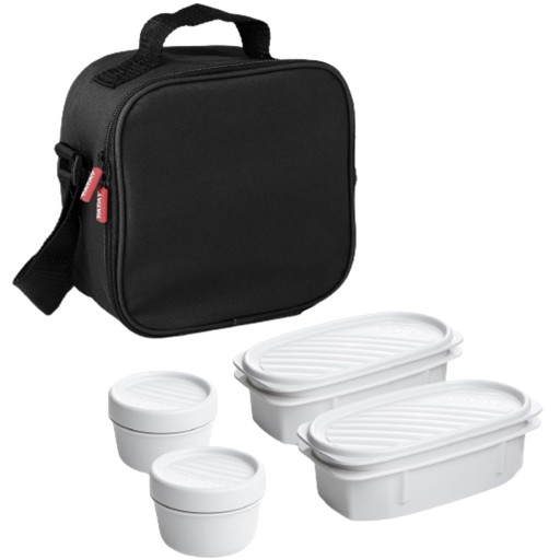 Сумка містить 4 міцні та ударостійкі контейнери, виготовлені з пластику, який не містить шкідливих сполук BPA, і може використовуватися як у мікрохвильовій печі, так і в холодильнику чи морозильній камері. А якщо підтримувати їх у чистоті, їх можна мити в посудомийній машині.