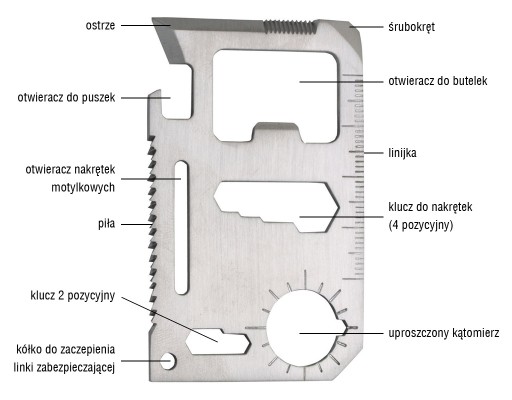 Компактний, зручний сталевий інструмент розміром з кредитну картку, який може знадобитися щодня і в багатьох складних ситуаціях. Розмір інструменту дозволяє носити його в гаманці або кишені. Картка може полегшити наше життя в багатьох ситуаціях, особливо під час подорожей, поїздок, таборів, кемпінгу або напр. Карта має практичний чорний футляр. Картка має багато корисних функцій, серед яких: ніж, пила, викрутка, гайкові ключі 4-10 мм, лінійка, відкривачка для консервів, пляшок...