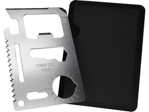 Найнеобхідніше для виживання у вигляді сталевої картки, яка поміщається у ваш гаманець. Це допомагає в повсякденних ситуаціях, наприклад, при відкритті пляшки, а також у екстремальних ситуаціях, наприклад, при поломці автомобіля чи машини