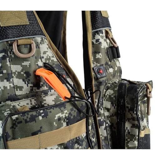 Жилет оснащений свистком і смугою світловідбиваючої плівки, розміщеної на спині.
