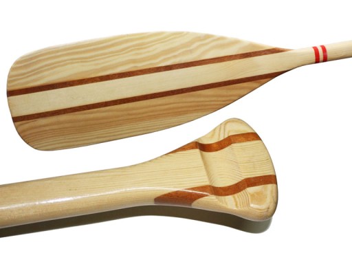 Весло з сосни та червоного дерева. Завдяки склеєній та лакованій структурі не коробиться при контакті з водою.