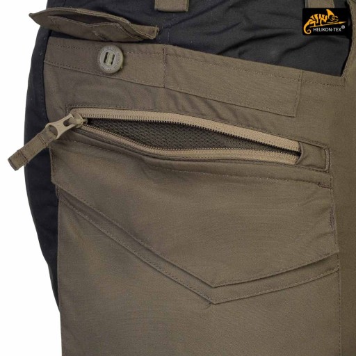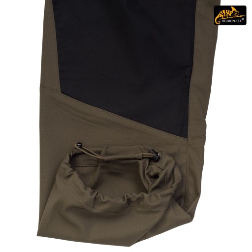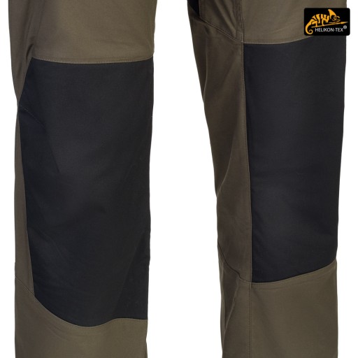 Штани в місцях, найбільш схильних до зносу (сидіння і коліна), посилені додатковим шаром матеріалу більш темного кольору, який додатково маскує бруд. Коліна оснащені анатомічними складками, які забезпечують додатковий комфорт і захищають від висування матеріалу. Внутрішні кишені для поролонових вставок (Helikon Low Profile Pad) - протектори колін. Накладні та бічні кишені застібаються на міцні блискавки від японського бренду YKK. Застібки-блискавки бічних кишень оснащені стрічками для спрощення їх роботи. Суцільні шви, множинні в критичних місцях. Краї матеріалу закріплені оверлочною строчкою. Внутрішні підсилення з нейлонової стрічки в місцях, які найбільш схильні до розриву.