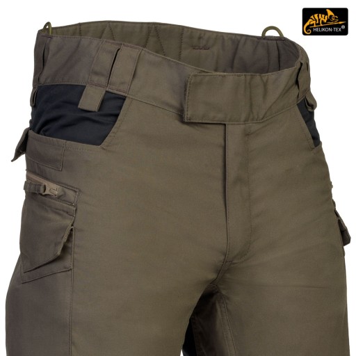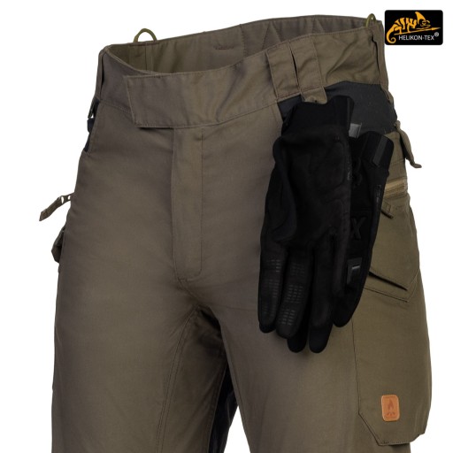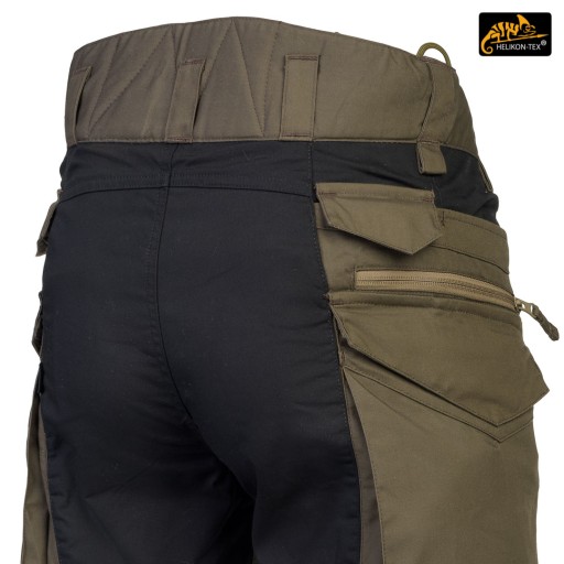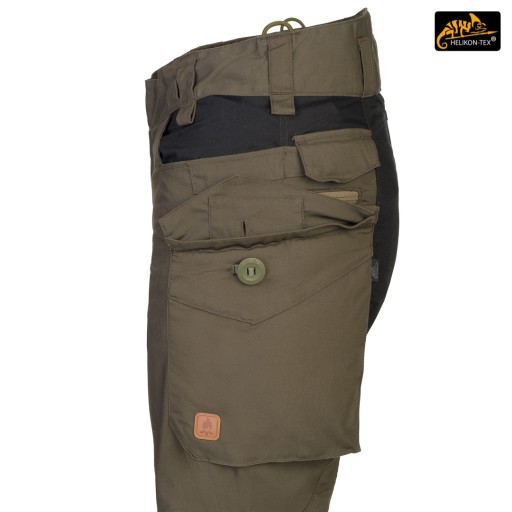 Універсальний крій гарантує практичність, комфорт і гарний зовнішній вигляд. Прямі штанини та плоскі кишені не асоціюються з типовими бойовими штанами, що робить штани ідеальними для повсякденного носіння. Довга застібка на блискавку YKK, покрита клапаном. Застібається на талії за допомогою липучки, яка дозволяє регулювати окружність під анатомію користувача або при носінні утеплюючої білизни під штанами. Ремінь і шлевки виготовлені з подвійного шару матеріалу для міцності. Штани мають розширення ззаду, яке захищає поперек і область нирок при нахилі або сидінні. Подовжена частина на спині має м'який наповнювач з дихаючої розпірної сітки MESH 3D, що дозволяє зберегти тепловий комфорт і комфорт використання разом з жорсткими лямками. Щільно розташовані шлевки для пояса шириною 50 мм. Під бічними і передніми шлевками є петлі для кріплення підручних речей за допомогою мотузки або карабінів (наприклад, гримлок). Ластовица, вшита в промежину, гарантує свободу рухів при високому підйомі ніг. Петлі з паракорду, вшиті з боків, використовуються для кріплення підтяжок (Helikon Forester Suspenders). Внизу штанини є манжети, які дозволяють притягнути ногу до взуття. Манжети з еластичної гуми Shock Cord, оснащені стопором для швидкого регулювання і спеціальним тунелем, який захищає вільний кінець манжети від випирання з ноги.