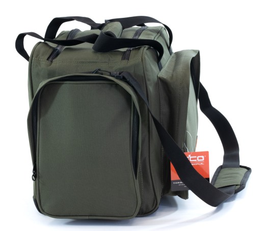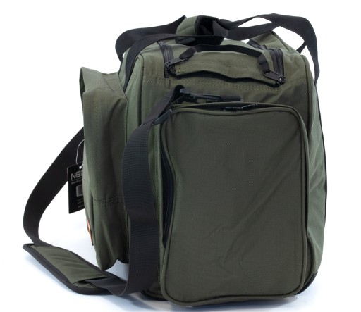 Зручна рибальська сумка з водонепроникного неопрену. Має містке основне відділення об'ємом 31 літр, застібається на подвійну блискавку і ребра жорсткості по бічних краях. На передній частині сумки є велика кишеня на блискавці і дві бічні кишені, також на блискавці. Краї всіх кишень посилені. Сумка має міцний і регульований плечовий ремінь, і два менших ремінця, завдяки яким сумку можна носити в руці. Дно сумки посилене гумовим покриттям і має чотири гумові ніжки.