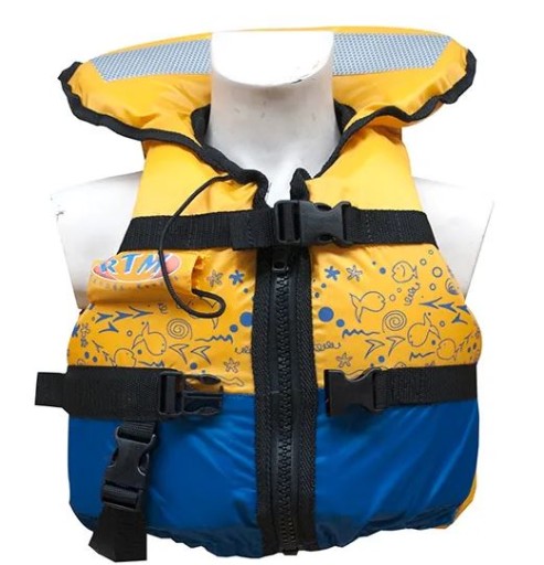 Дитячий рятувальний жилет на блискавці. Спеціальний дизайн для дітей. Для пристосування рятувального жилета до тулуба дитини використовуються дві поперечні лямки, що застібаються пряжками, а промежинова лямка не дає жилету піднятися після падіння у воду, під шию дитини. Оснащений сигнальним свистком. Після падіння у воду дитина ляже на спину. Надійні матеріали та якість виготовлення.