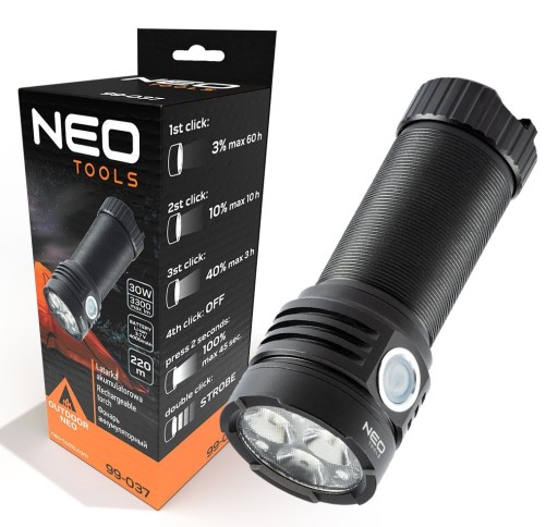 Акумуляторний ліхтар NEO (арт. № 99-037) оснащений сучасними світлодіодами OSRAM P9 зі світловим потоком 3300 люмен і потужністю 30 Вт.