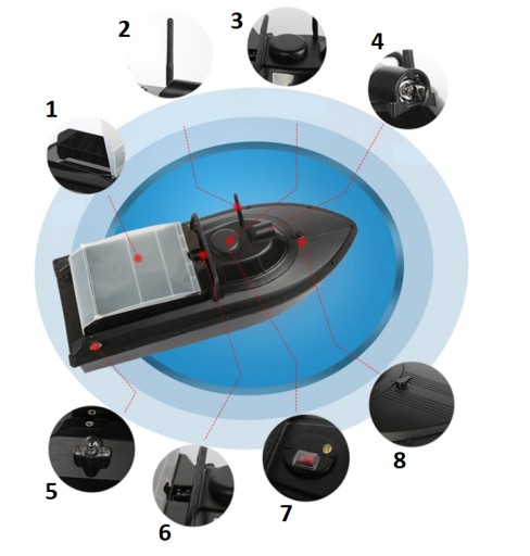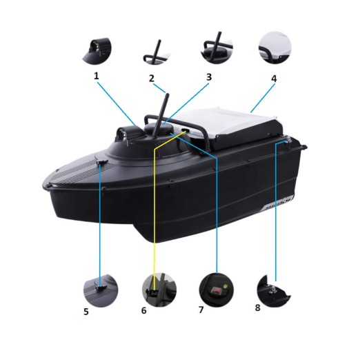 - 1x 10AH 7.4V 1x 10AH 7.4V акумулятор (один всередині човна, інший додатковий)