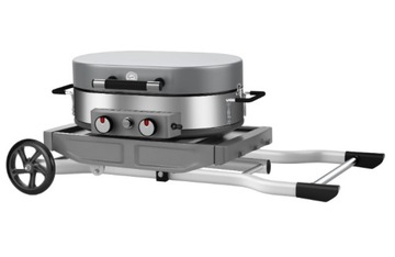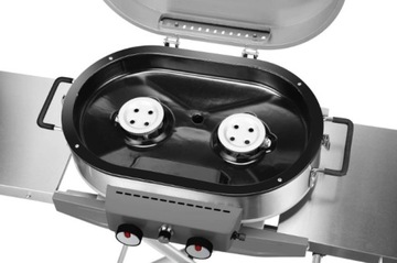 Pomimo kompaktowych wymiarów, urządzenie oferuje dwa palniki, dużą powierzchnię grillową (podzieloną na dwie części w ruszcie i płycie, każda z żeliwa i emaliowana) oraz duże wysuwane półki. Praktyczne zaczepy na przybory kuchenne zapewniają, że zawsze masz pod ręką wszystkie niezbędne przybory.