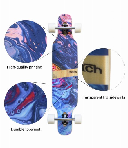 Його конструкція робить його фантастичним для їзди містом - профіль розвалу разом із легким увігнутим покриттям гарантують чудове відчуття дошки, а отже, підвищений комфорт водіння завдяки своїй маневреності. Подвійний наконечник — це форма, створена для трюків, тоді як серцевина з тополі та ясена, поліуретанові бічні стінки та конструкція зі скловолокна надають лонгборду Switch надзвичайної гнучкості, зберігаючи надзвичайно міцну конструкцію. Траки з верхнім кріпленням дозволяють знизити центр ваги на дошці, що робить натискання на ній набагато менш стомлюючим, ніж у випадку з дошками з вантажівками з нижнім розташуванням.