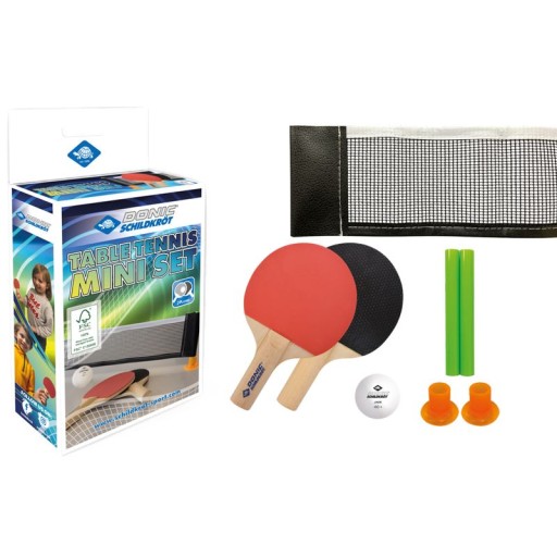 Міні-набір для настільного тенісу Donic-Schildkröt - міні-набір для настільного тенісу - чудова розвага для молоді та старих, а також активна форма відпочинку. Просто прикріпіть невелику сітку (57 x 7,5 см) до гладкої поверхні за допомогою пластикових стовпчиків із присосками, і ви зможете насолоджуватися грою практично будь-де. Дві маленькі ракетки (14,5 х 9 см) виготовлені з сертифікованої деревини та покриті гумовим покриттям. У набір також входить трохи менша пластикова кулька ∅35 мм. Якщо він зламається або загубиться, ви можете грати будь-яким м'ячиком для настільного тенісу (∅40 мм).