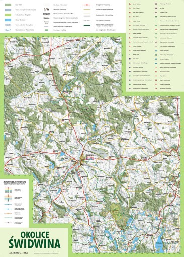 Мапа охоплює гміну Свідвін та сусідні території. Окрім стандартних пішохідних та велосипедних маршрутів, тут є також марковані кінні стежки, які останніми роками проклало Свідвінське лісництво, навчальні стежки та стежки для скандинавської ходьби. Описовий вміст включає Стежку Свідвіна, що веде через райони боїв з німецькою армією в березні 1945 року та визначні пам’ятки Свідвіна. Рибалки, безсумнівно, будуть задоволені, що на карті є, серед інших. дуже точні батиметричні плани наступних озер: Клецє, Буковець, Бжезьно, Бистжино Мале та Велке з основними даними. Знайшлося місце і для плану міста 1:10 000.