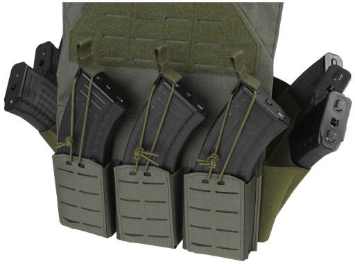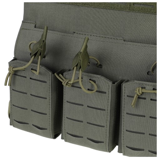 На передній частині жилета є 3 фіксованих магазинних підсумка з страховочними тросами, додатково оснащені системою Molle/Pals, виготовленою за технологією Laser Cut.
