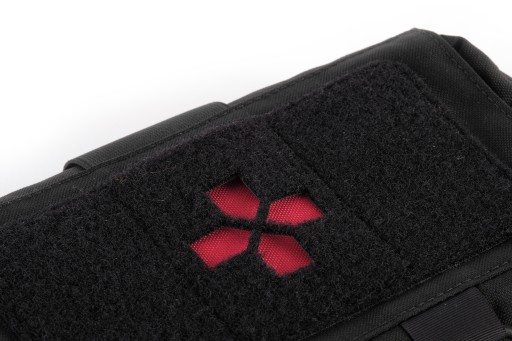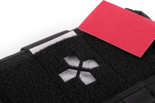 На передній стінці рукава велика липучка з хрестоподібним вирізом. У комплект входить двостороння вставка, яка дозволяє отримати цілих три кольори хрестика на вибір: червоний, світловідбиваючий, а при витягуванні вставки колір відповідає кольору аптечки.