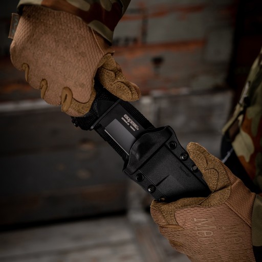 У набір входить чохол із Secure-Ex, який завдяки численним отворам і прокладкам дозволяє багатопозиційно кріпити на поясі або спорядженні. Ніж надійно утримується в піхвах за допомогою вхідного отвору та петлі для ременя, яка застібається на засув.