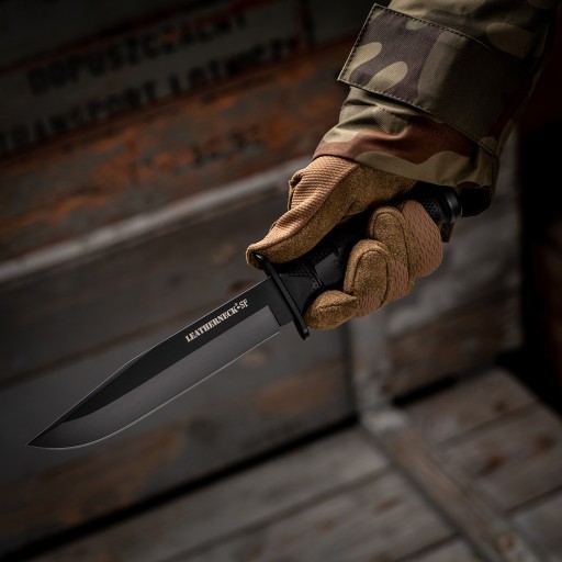 Лезо з профілем clip-point виготовлено з високоякісної інструментальної сталі D2, лезо виконано з частковим плоским зрізом. Чітко позначене ложне лезо проходить від кінчика до 2/3 довжини леза, що зменшує вагу ножа та полегшує його встромлення. Все це покрито стійким до подряпин покриттям Black Powder. Це покриття підвищує стійкість до корозії та в деяких випадках зменшує небажані відблиски.