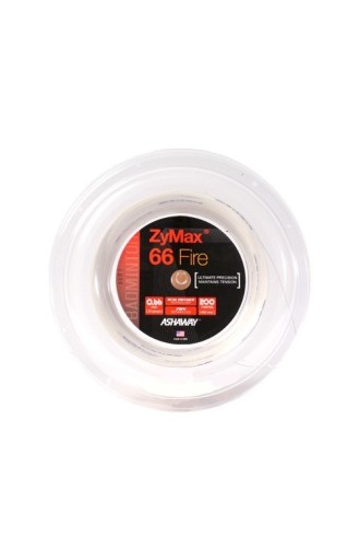 Струна для бадмінтону ZyMAx 66 Fire Power. Після періоду інтенсивного розвитку Ashaway представляє нову серію ZyMax® FIRE! Виготовлений з революційного матеріалу BETA Polymer. Струни Ashaway ZyMax® FIRE є першими, які включають бета-волокна з технологією ZyWeaVe для оптимальної міцності та довговічності. Ця струна гарантує потужну силу удару! Ідеальна пропозиція для гравців, які віддають перевагу високій точності ударів, але в той же час цінують високу міцність на розрив. Струна на 200-метровій котушці призначена для авторизованих служб гри в ракетки, а також для гравців, які часто замінюють струни через інтенсивні тренування.