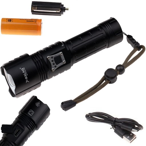 Ліхтарик X-BALOG BL-P712-P120 L-093A, літій-іонний акумулятор 26650, USB-кабель, перехідник для батарейок AAA, шнурок для рук, коробка.