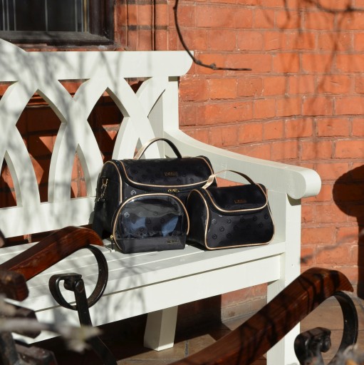При розробці цієї моделі була продумана кожна деталь - дві блискавки, посилена ручка, плечовий ремінь, металеві ручки для золотистих пряжок. Золота обробка чудово гармонує з насиченим чорним матеріалом, з якого виготовлена косметичка.