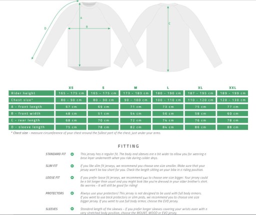 - Подовжені рукави - довжина, призначена для положення, яке ви зазвичай приймаєте на велосипеді (зауважте, що сучасна геометрія рами з розширеним переднім трикутником забезпечує більш розширене положення). Навіть при сильно зігнутому положенні і витягнутих руках рукава закривають зап'ястя. Якщо ви віддаєте перевагу відкритим передпліччям, просто закатайте рукава.