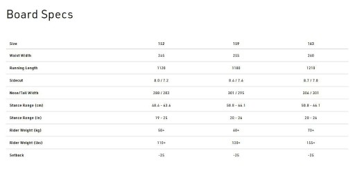 довжина 163 см, ширина носа/хвоста 30,6/30,1 см, обхват талії 26 см, радіус 8,7/7,8 м, діапазон стійки 50,8–66,1 см, відступ (-25), довжина бігу 1210, підходить для людей вагою 70+ кг