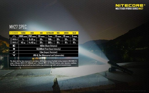 MH27 випромінює потужний промінь, який може досягати великої відстані з удвічі більшою інтенсивністю, яка стала можливою завдяки революційній технології SC5, яка використовує діод CREE XP-L HI V3. У поєднанні з технологією покриття Nitecore Crystal Coating забезпечує вражаюче освітлення, яке можна порівняти з фарами з більшими відбивачами.